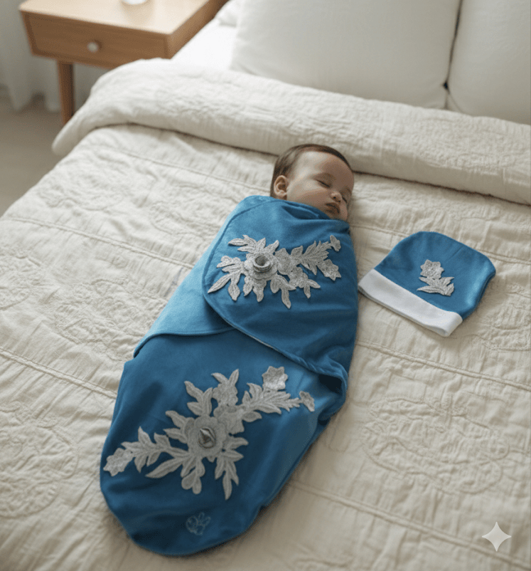 Embrace the serene elagance of winter with our Azure Bloom Velour Swaddle Set, desgined to keep your baby snug and stylish during the chilly season. Made from ultra soft velour, the luxurious swaddle provides unmatched comfort while featuring delicate floral embroidery for a touch of timeless sophistication. The calming blue hue adds a cool, refreshing charm, perfect for winter days and special moments.