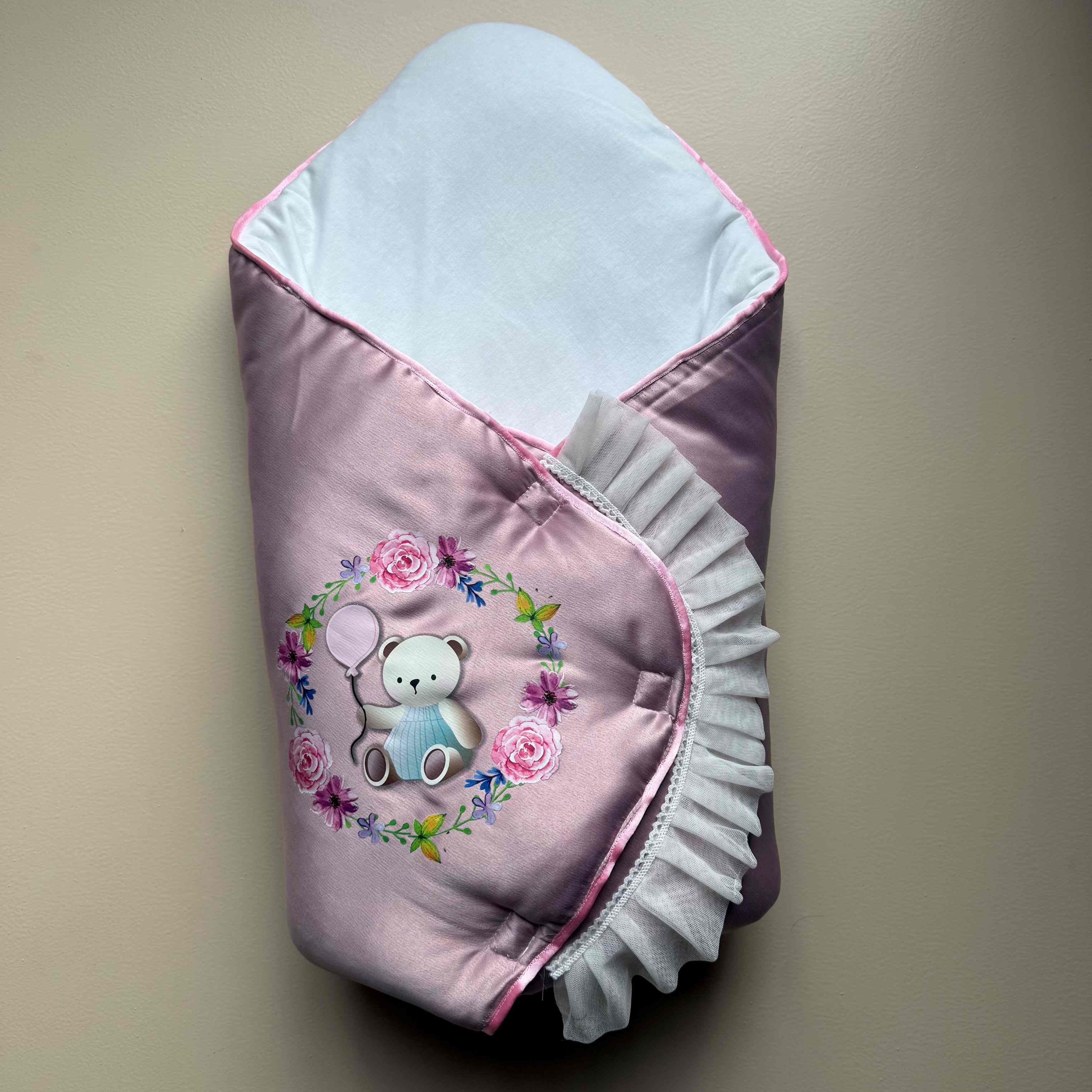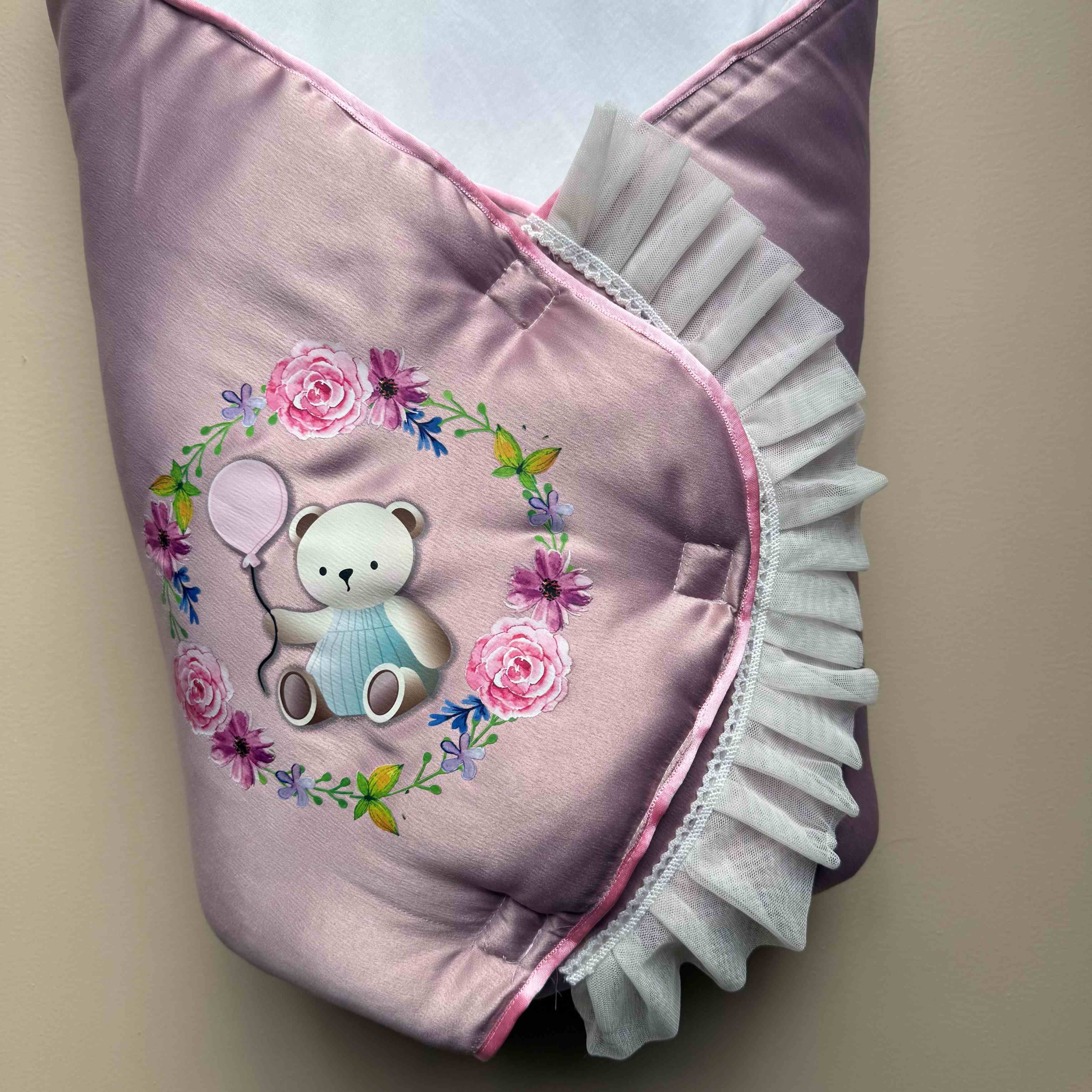 The blush-pink satin surface features an adorable teddy bear print at the center, surrounded by a floral wreath of roses and tiny blossoms in pastel shades—feminine, sweet, and eye-catching. Completing the design is a delicate net frill along the sides, enhanced with stitched white floral lace that adds a dreamy, luxe finish.