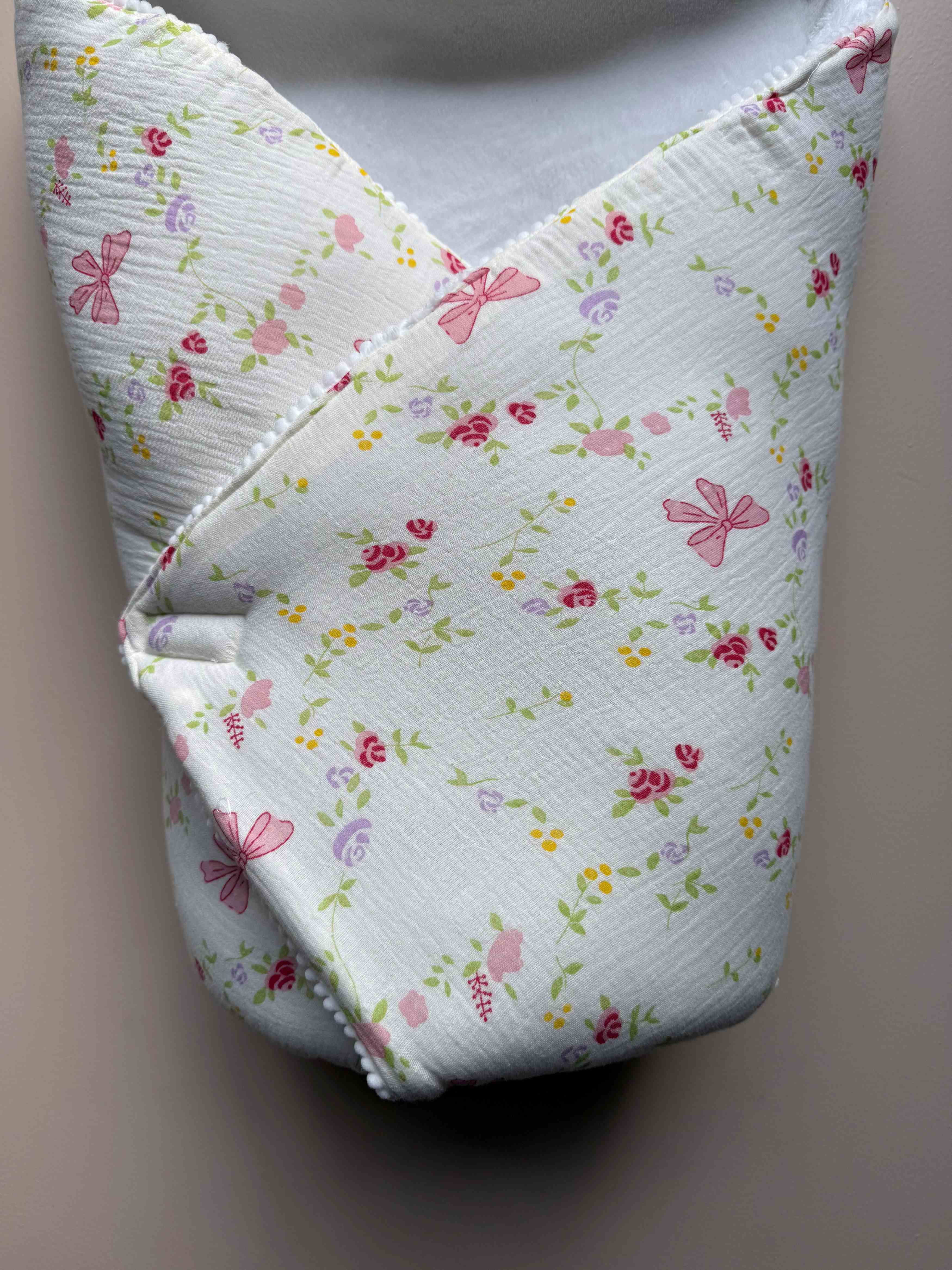 The outer layer is made from pure organic muslin featuring delicate florals and dragonflies, while the inside is lined with plush, gentle fur to keep your baby snug in the cold.