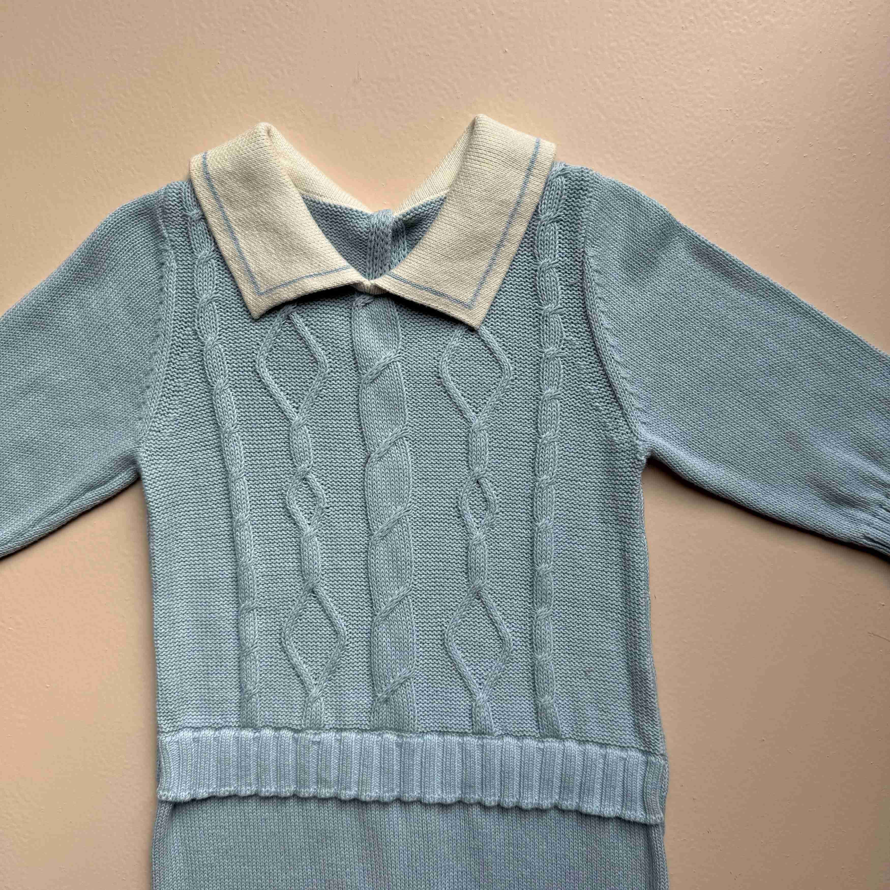 Featuring an elegant cable-knit design paired with a soft contrast collar, this romper brings a refined, vintage charm to your baby’s wardrobe. The ribbed waist adds structure and a snug fit, while bottom snap buttons make changing quick and easy.