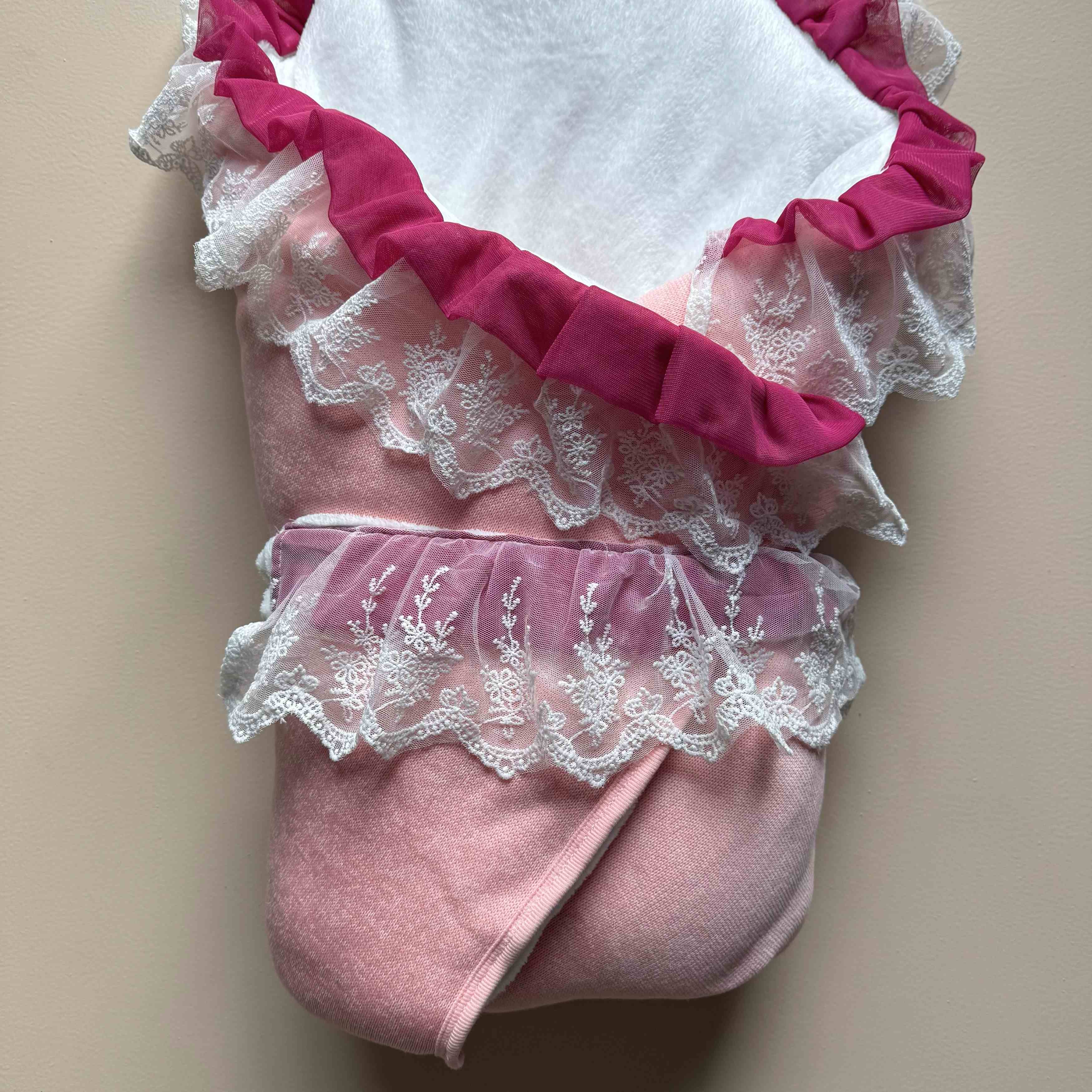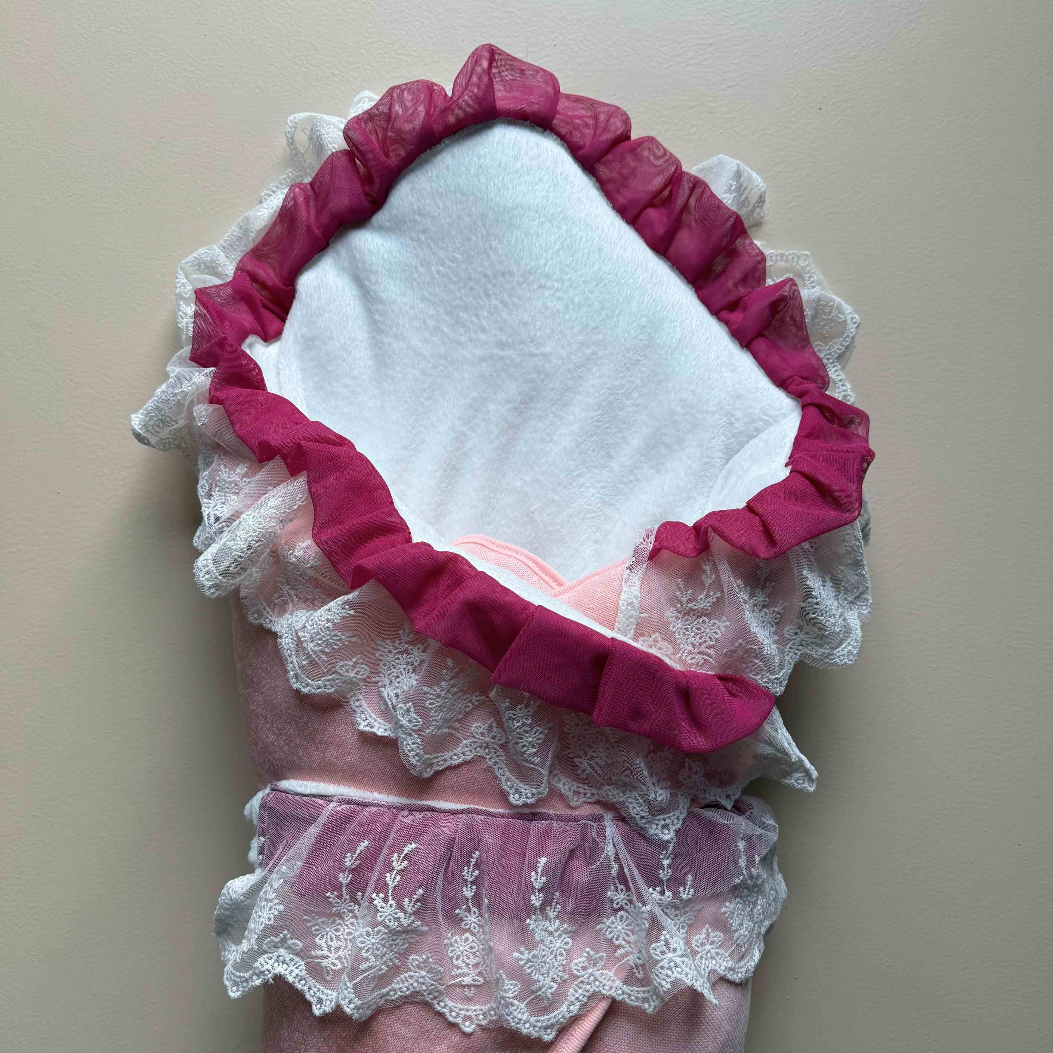 Designed with a soft knitted outer layer and fully fur-lined on the inside, this cozy winter drape keeps your baby snug through chilly days and peaceful naps. Delicate French lace detailing adds an heirloom touch, beautifully complemented by pleated pink net trims that frame the drape with graceful softness.