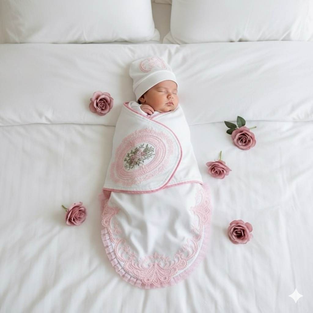 Blushing Blossoms Blooming Wrap Crafted from 100% soft cotton, the Rose Blush Swaddle Set wraps your baby in gentle warmth and stylish elegance. This set features a delicate blush pink lace border and a charming floral embroidery patch, designed to give your little one both comfort and a touch of classic sophistication. The included matching cap, adorned with the same intricate lace detail, ensures your baby stays cozy and beautifully coordinated.