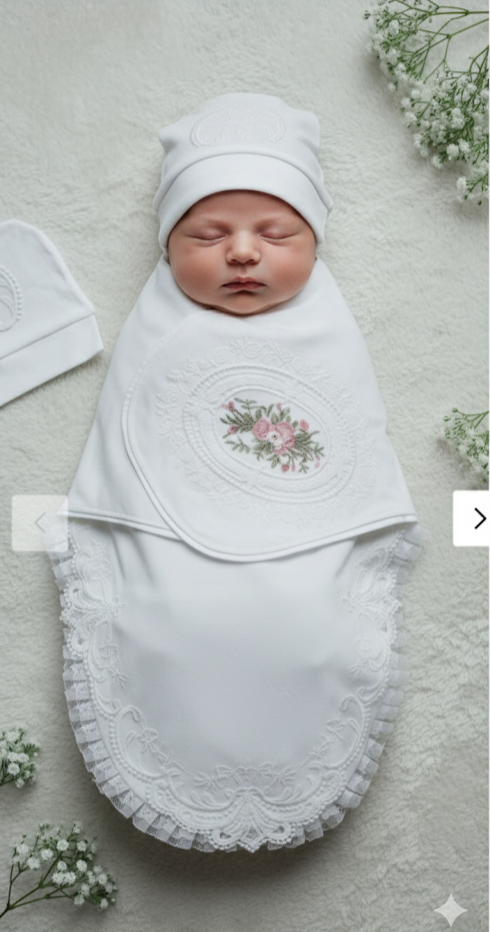 Embrace your baby in the Ivory Lace Embrace Swaddle Wrap designed to offer the ultimate in softness and style. This 100% cotton set features intricate white lace and a beautifully embroidered floral patch, giving a timeless and elegant look. The accompanying cap, adorned with delicate lace, ensures that baby stays cozy and perfectly matched. This set is ideal for providing a snug, graceful, and comforting experience for your little one.