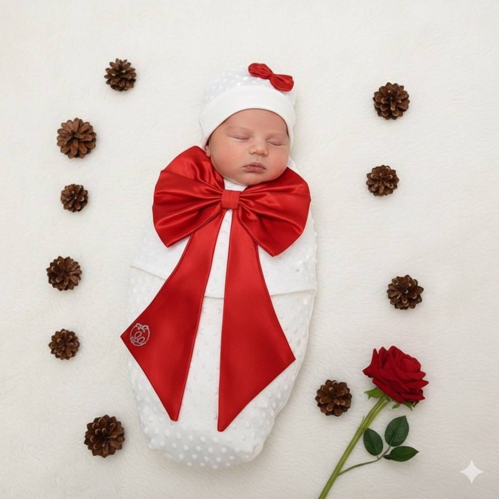 This cosy Christmas Drape swaddle wrap, is a ready to wear and extremely comfortable swaddle wrap, which comes in the white color. The addition of fiery bright red satin bow adds a touch of liveliness and makes for a luxurious buy.