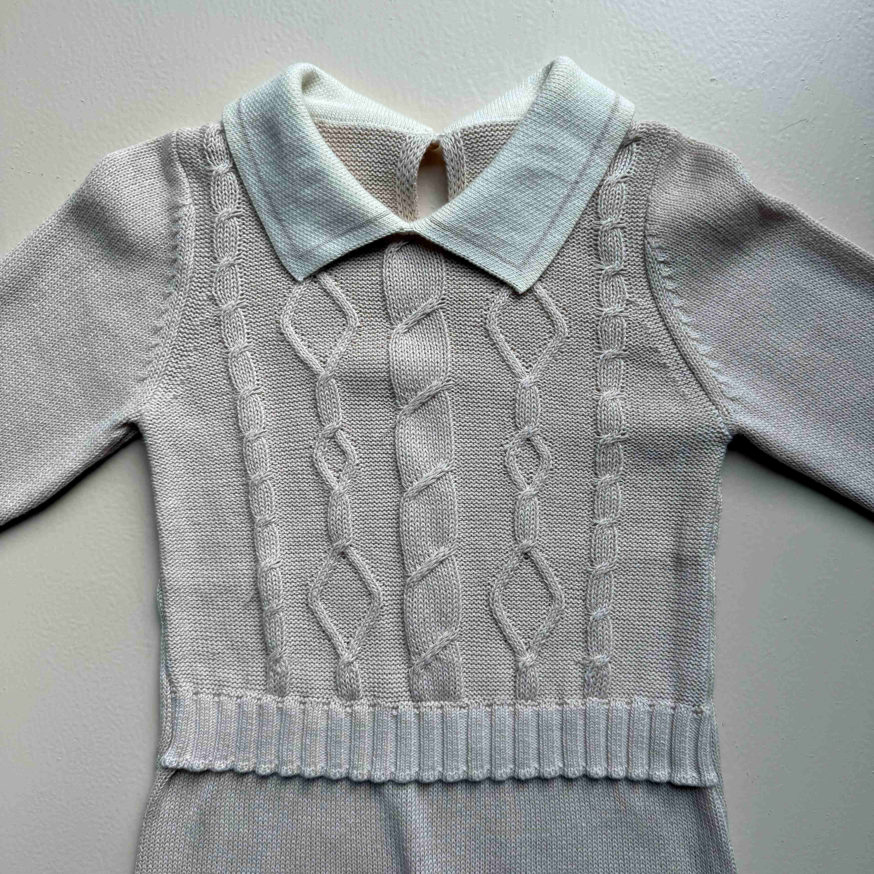 Featuring an elegant cable-knit pattern and a soft contrast collar, this one-piece brings a refined, heirloom look to your baby’s wardrobe. The ribbed waistband adds shape and comfort, while snap buttons at the bottom make changing quick and simple.