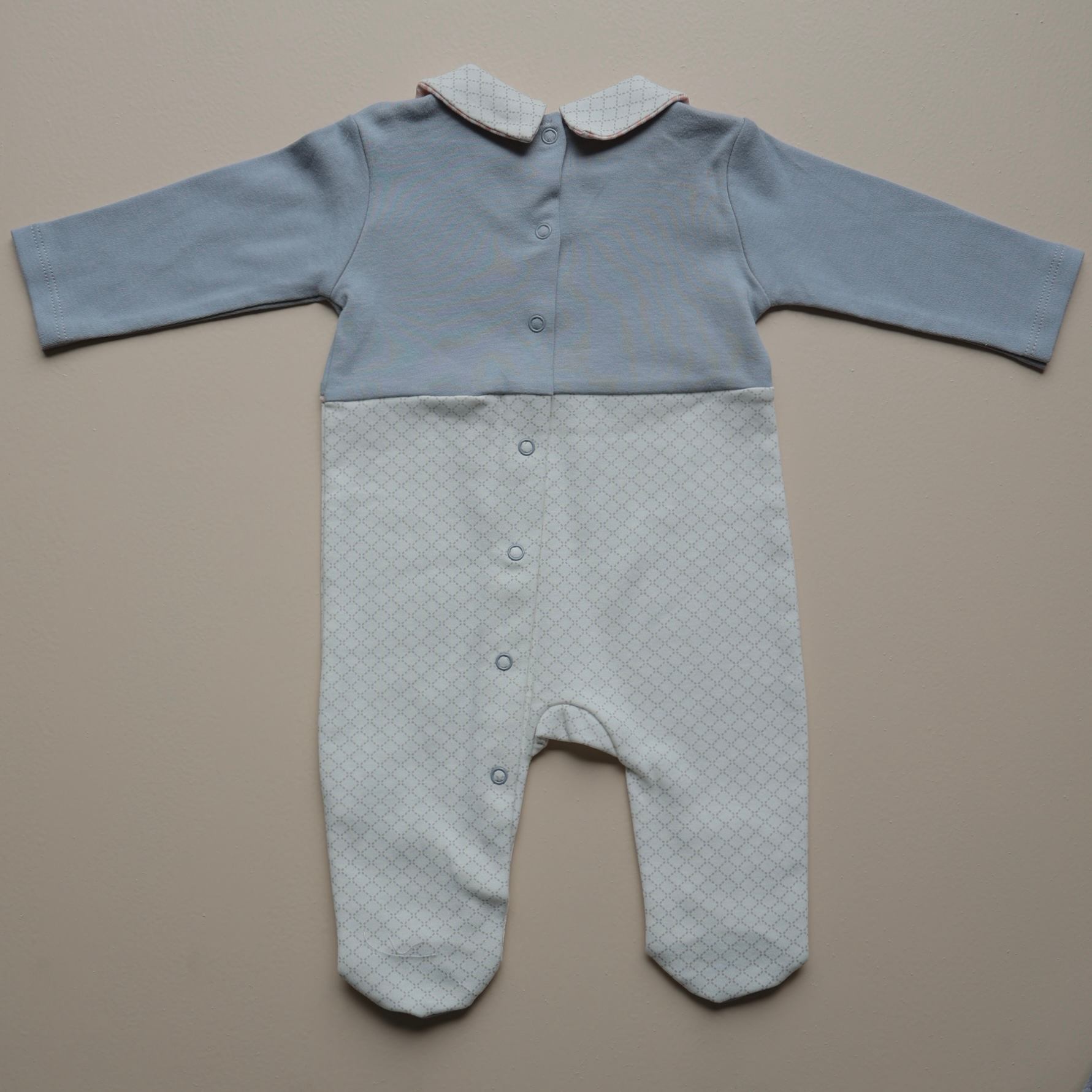 The soothing blue upper pairs beautifully with the subtle patterened lower half, finished with matching blue foot patches for a coordinated look.