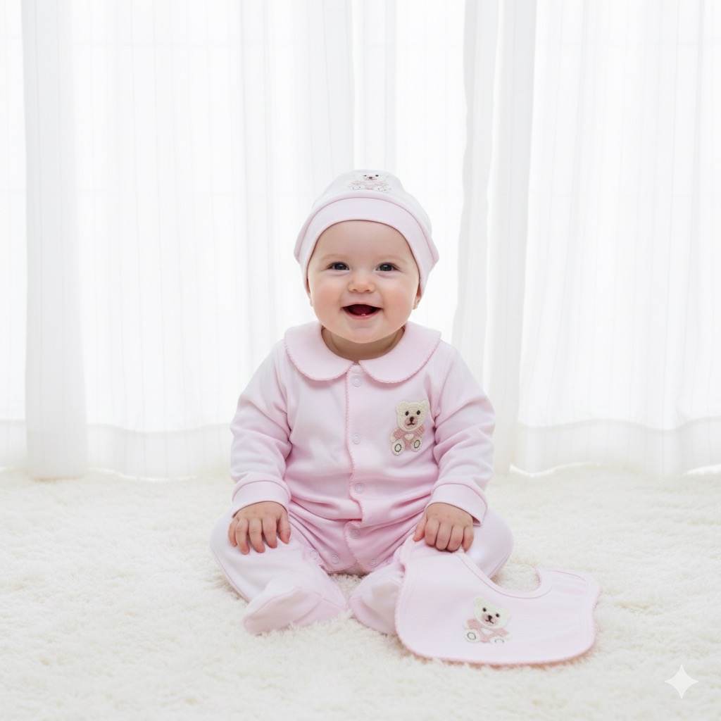 This set is thoughtfully crafted to ensure a cozy and snug fit, featuring elegant picot edging along the romper's collar and seems for a refined finish. The enchanting teddy bear embroidery adds a playful and heartwarming touch to this all inclusive set which includes: