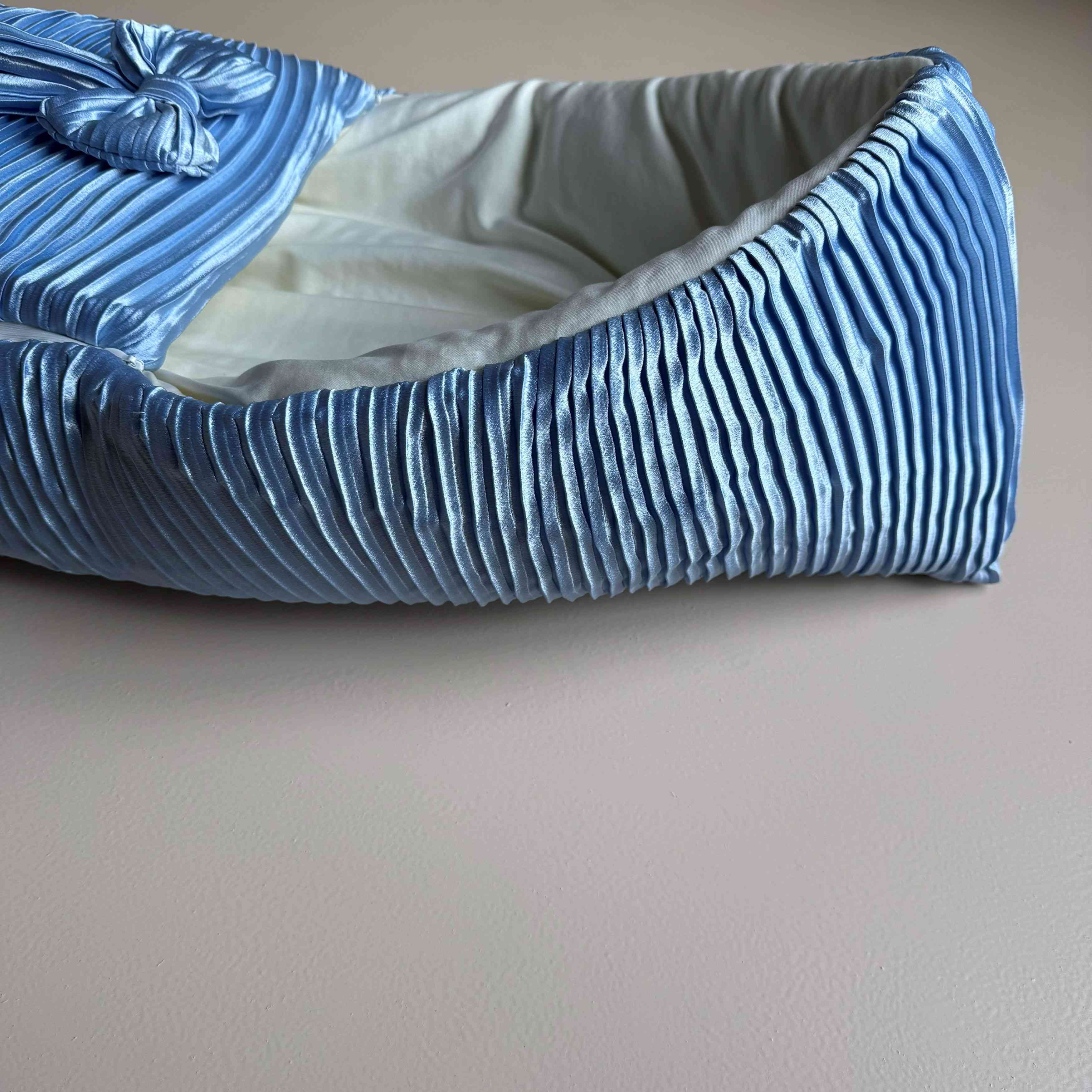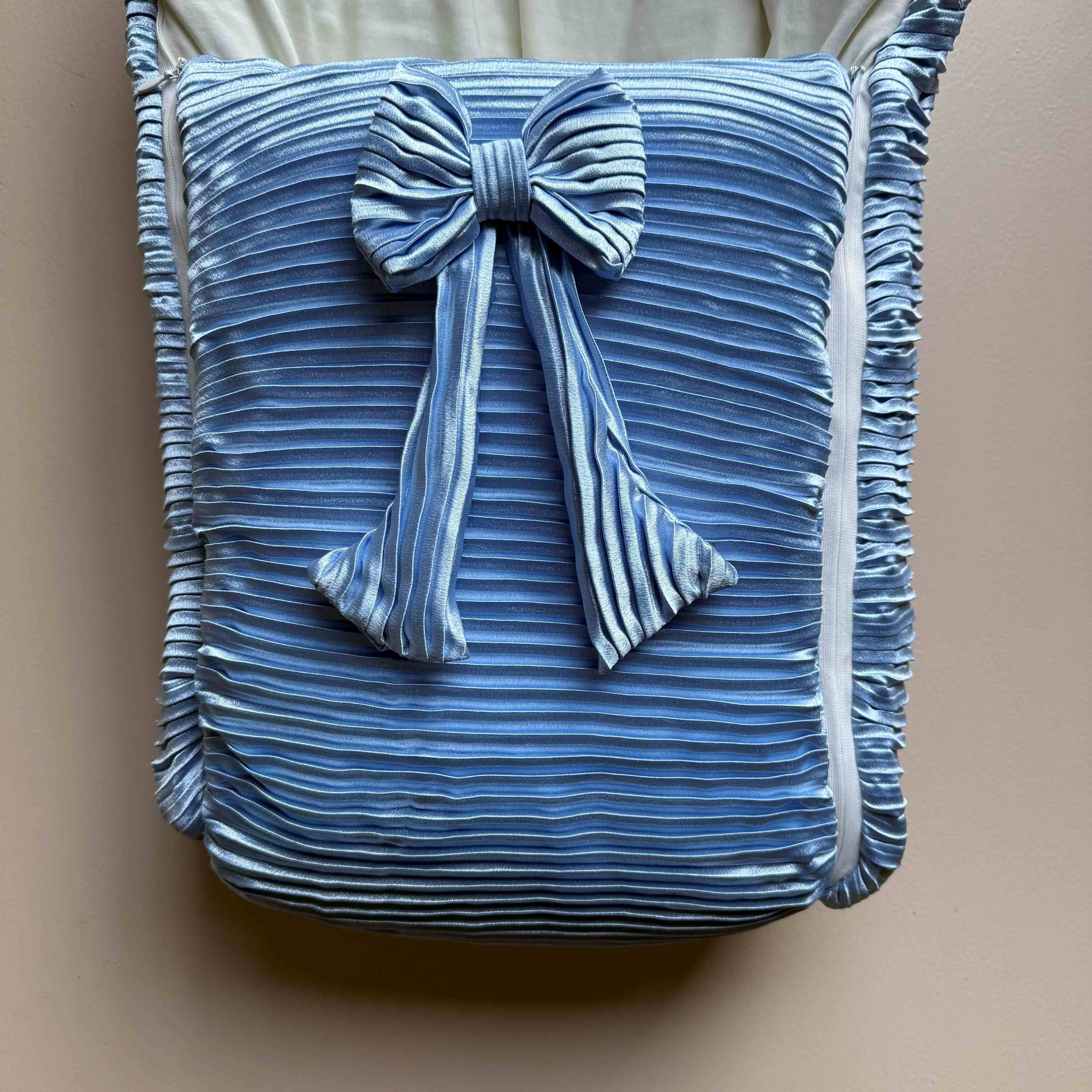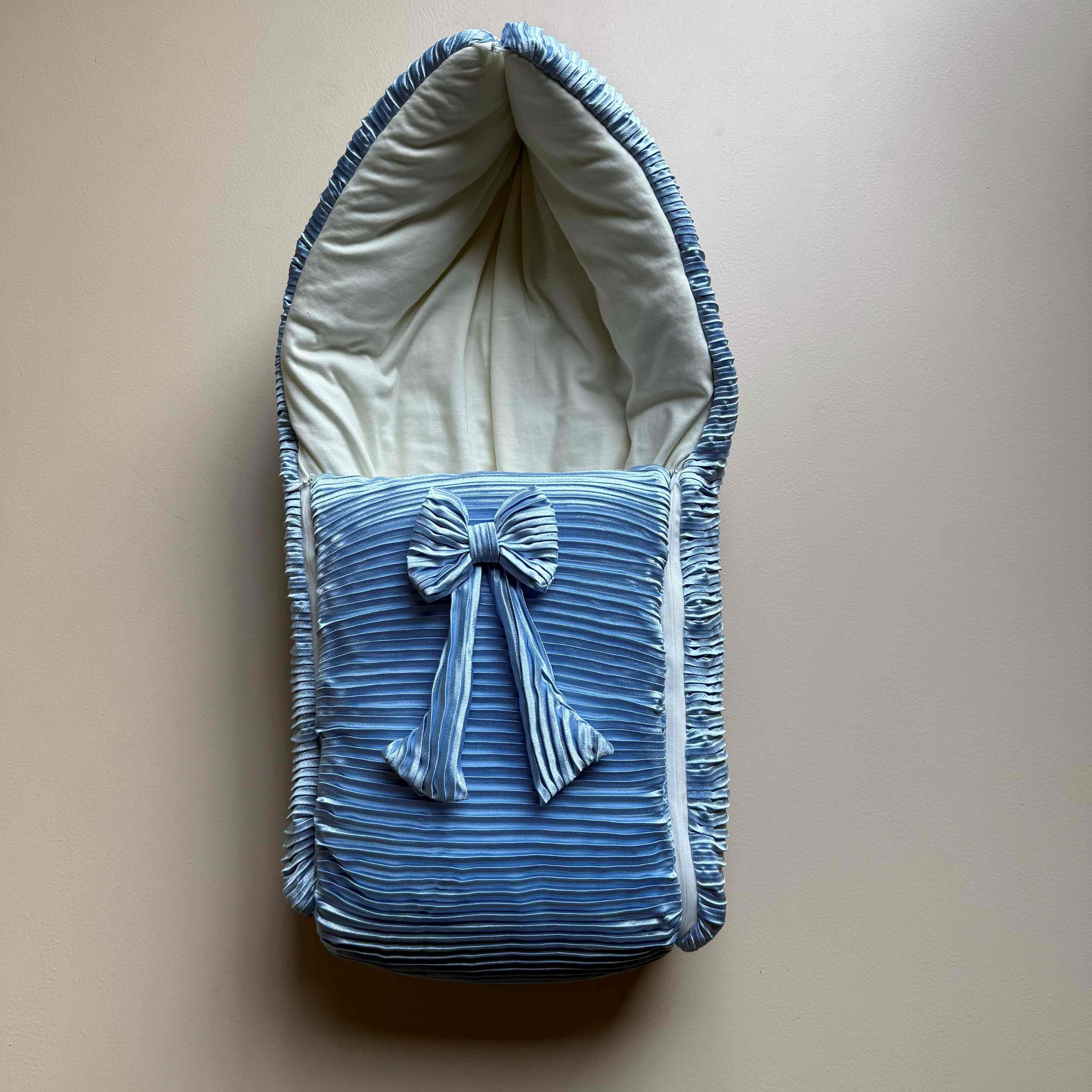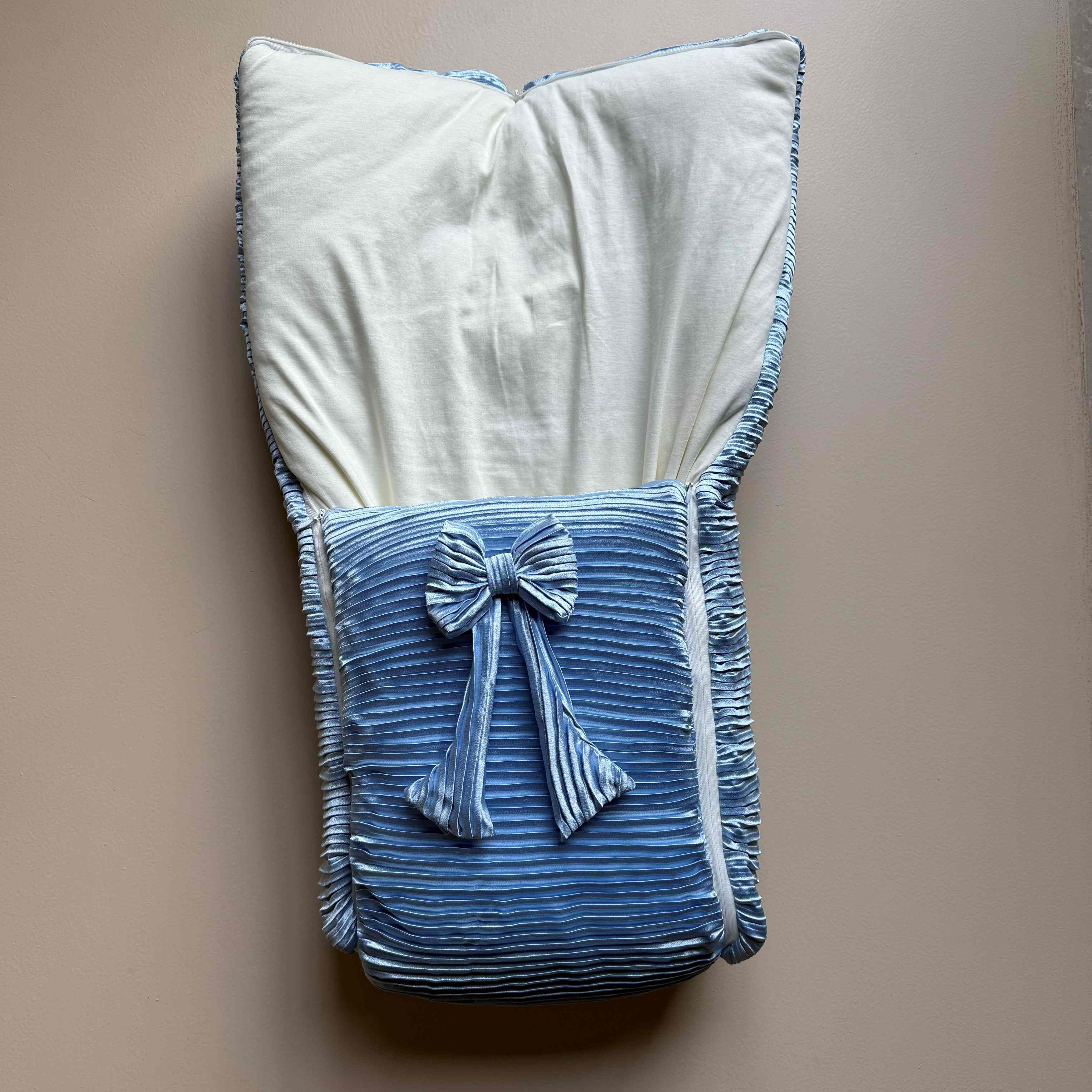 Our Ice Blue Baby Sleeping Bag is designed to create a calm and cozy sleep environment for your little one. The luxuriously pleated satin outer fabric adds a gentle sheen and an elevated aesthetic, while the 100% pure cotton lining inside keeps your baby snug, breathable, and comfortable through every nap.