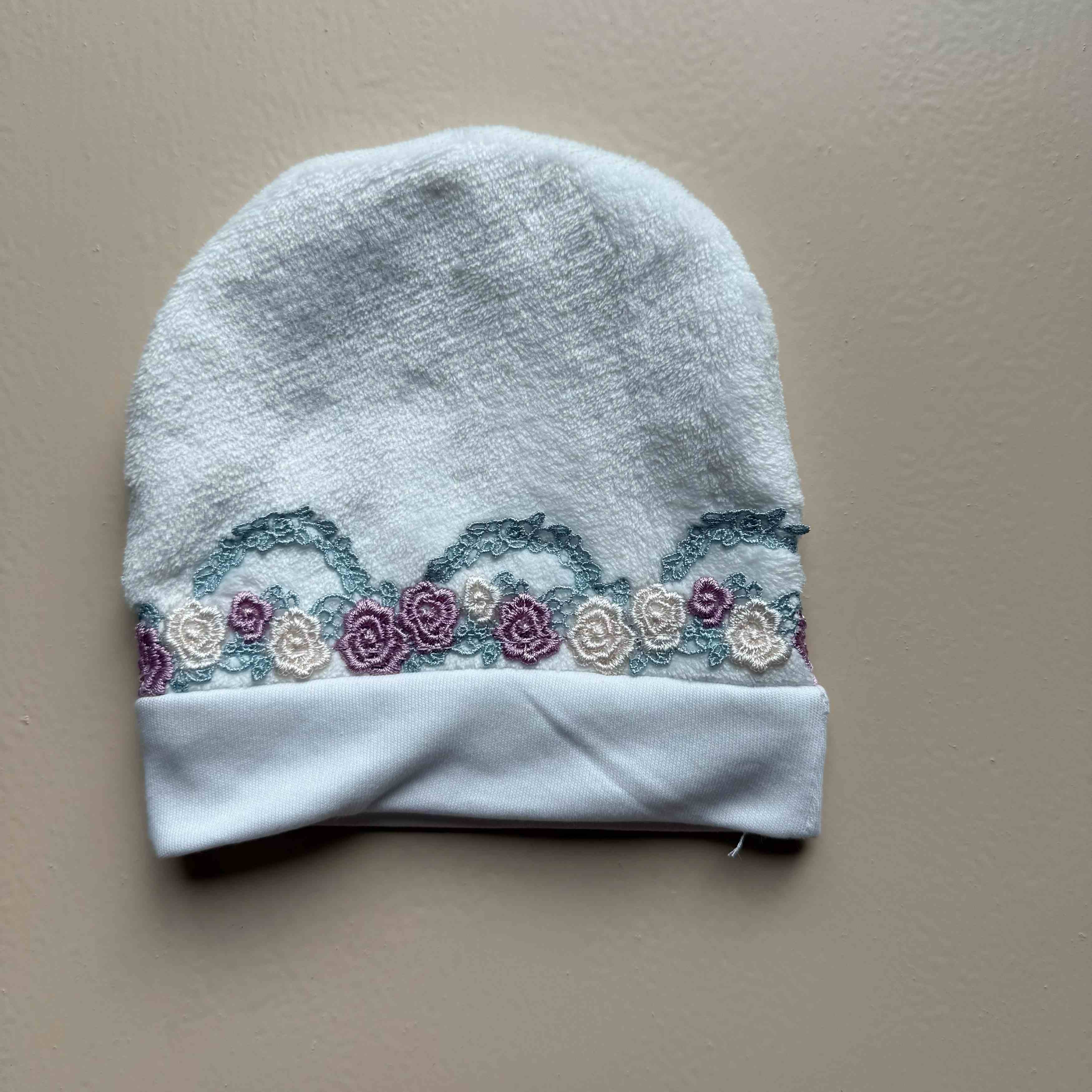 Designed with easy Velcro fittings, the swaddle ensures a secure yet comfortable wrap, helping your baby feel snug and soothed without complicated folding. The matching cap completes the look, keeping little heads warm while echoing the same refined lace detailing.