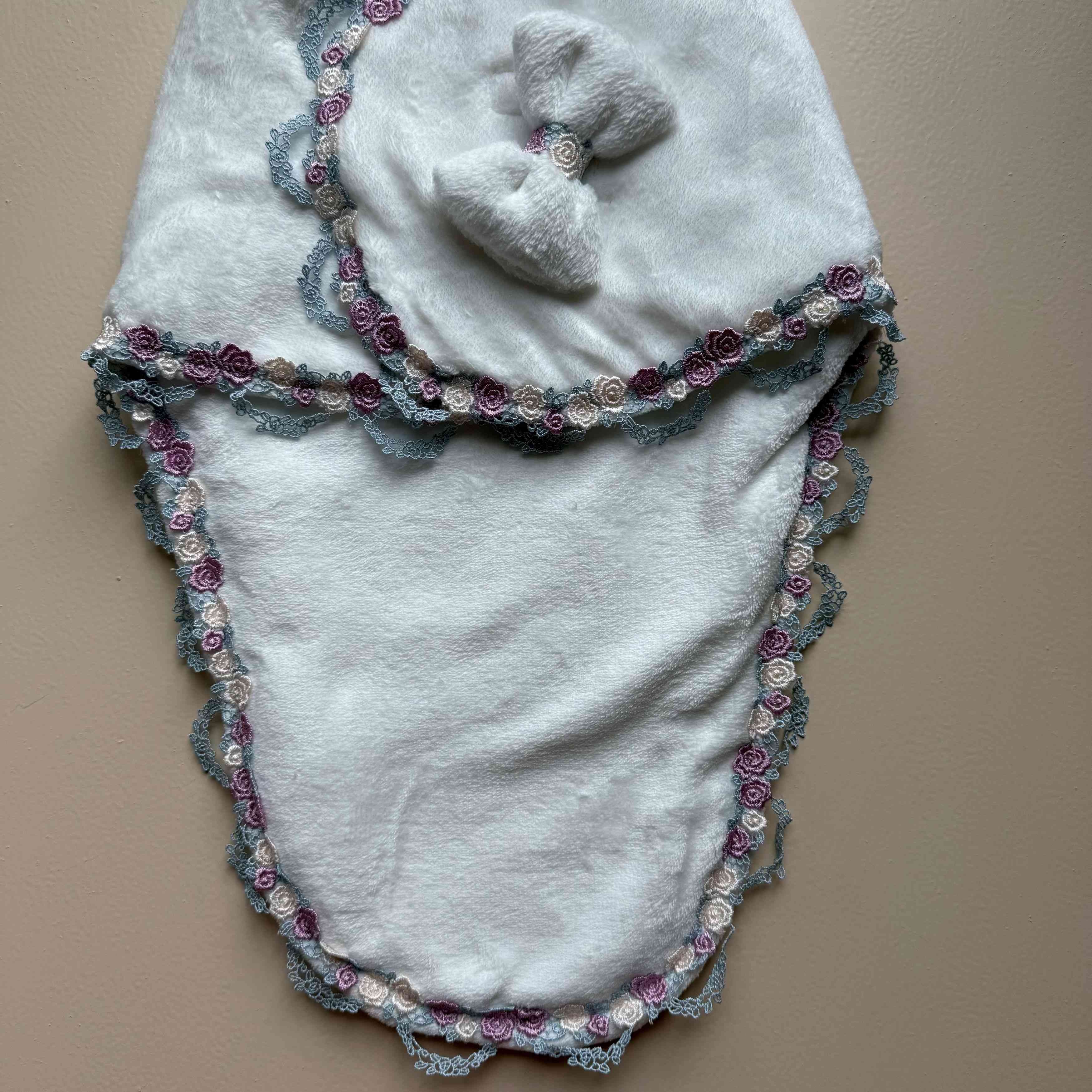 The swaddle is beautifully finished with delicate French lace trims running along the edges — soft, elegant, and gracefully detailed. The subtle lacework adds a touch of vintage charm, making this piece perfect not only for everyday winter use but also for special occasions and milestone photos.