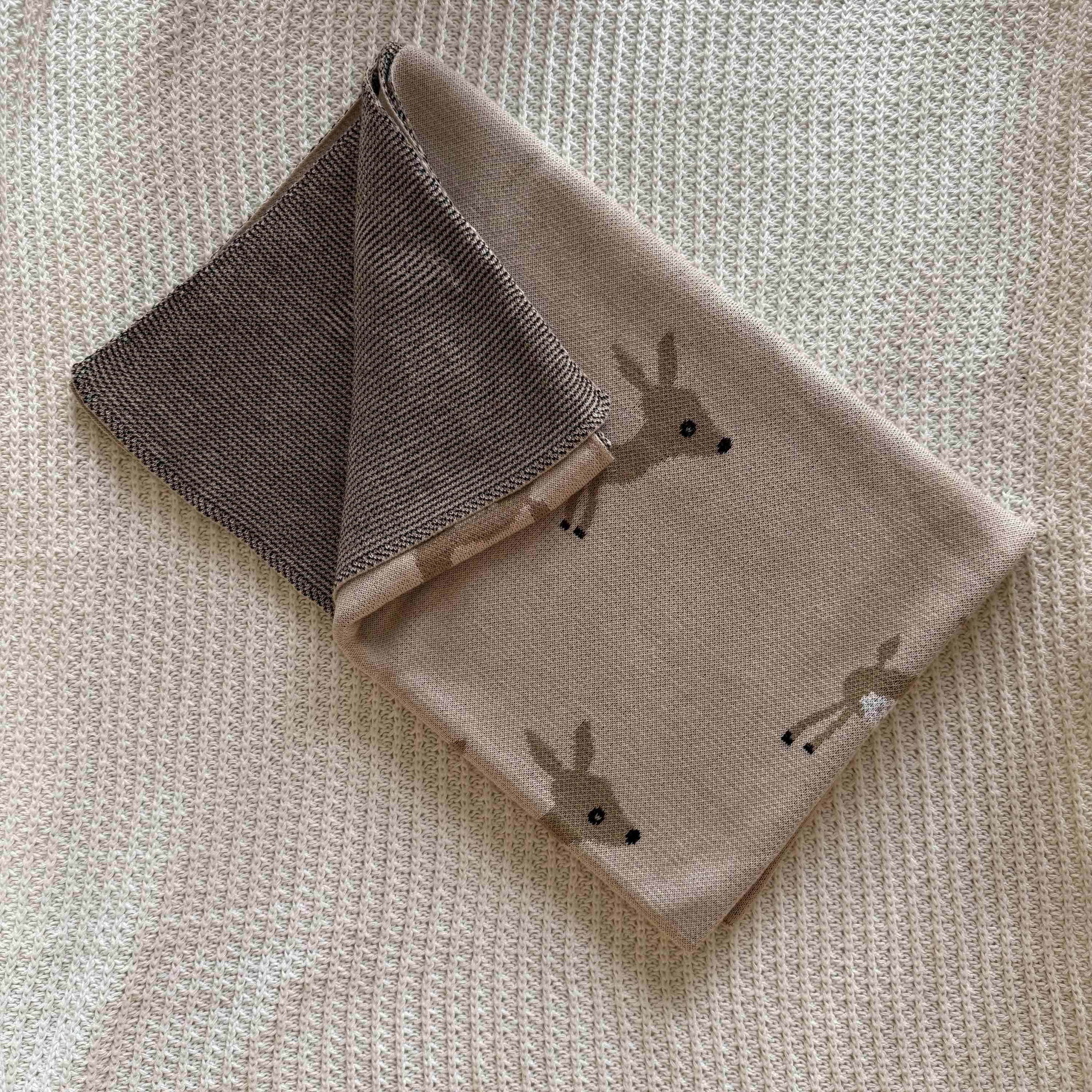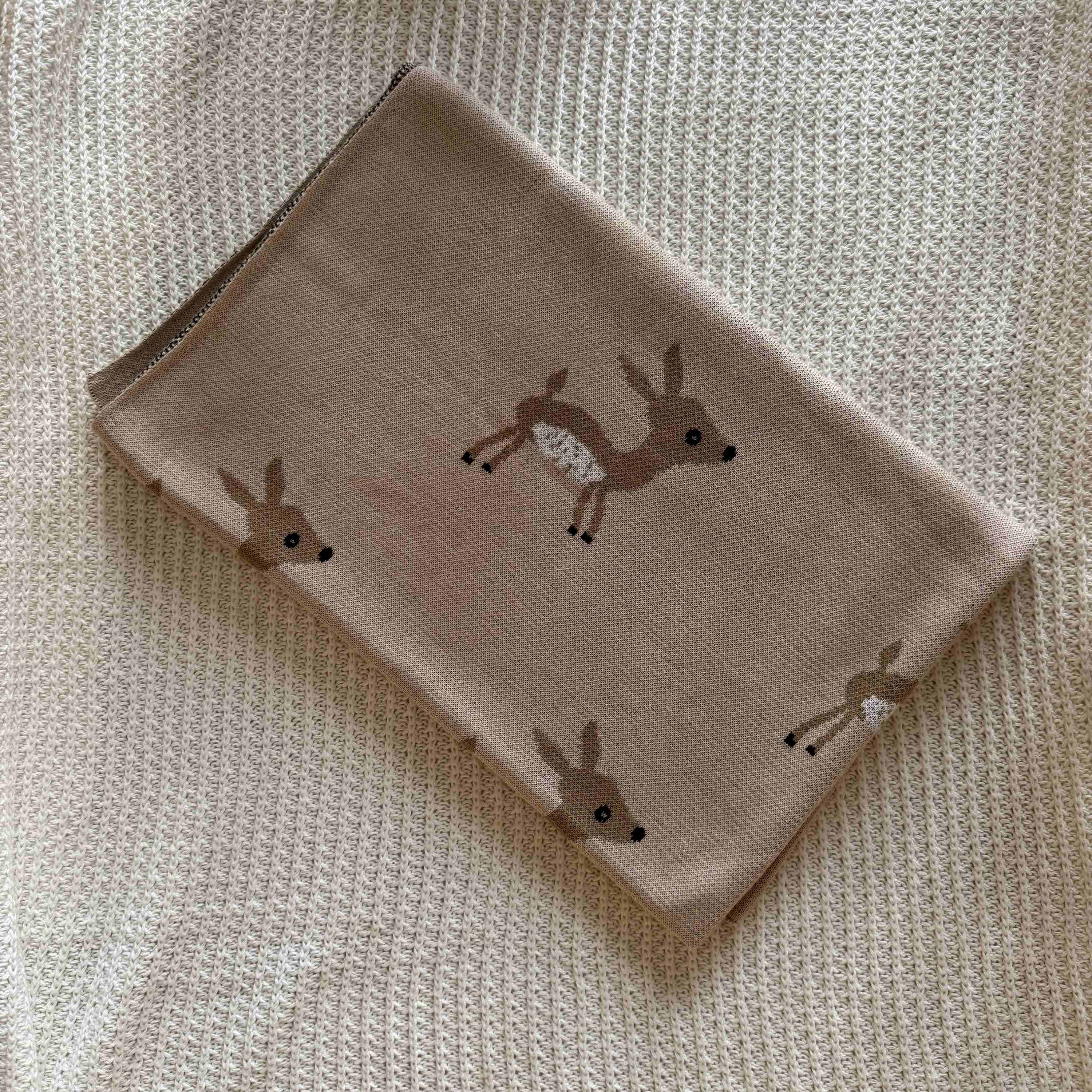 The blanket features a charming fawn print scattered across a soft beige background, creating a sweet woodland-inspired look. The adorable deer motifs bring a sense of calm, innocence, and playful elegance to your baby’s nursery, making the blanket both delightful and timeless.