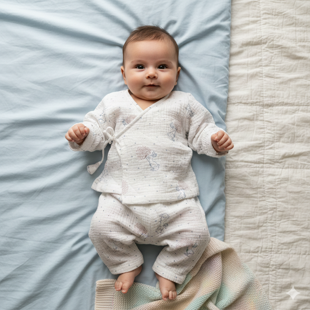 Made from 100% premium double-layer cotton muslin, the fabric has a naturally crinkled weave that enhances airflow and keeps your little one comfortable in every season. Feather-light, breathable, and exceptionally soft on newborn skin, it becomes even softer with every wash.