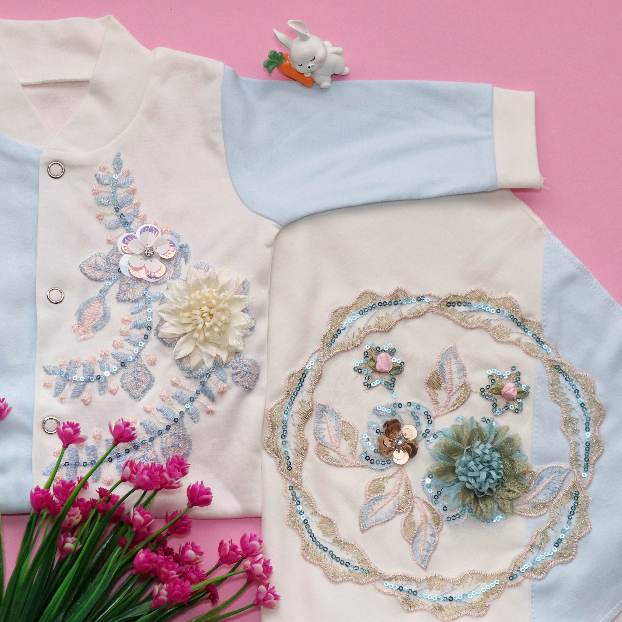The Baby Aroosa Natural Azzure Romper Set is a high-quality, cozy and customisable outfit for babies. The combination of blue and white, as well as the floral embroidery make for a visually appealing design for the little rockstar.