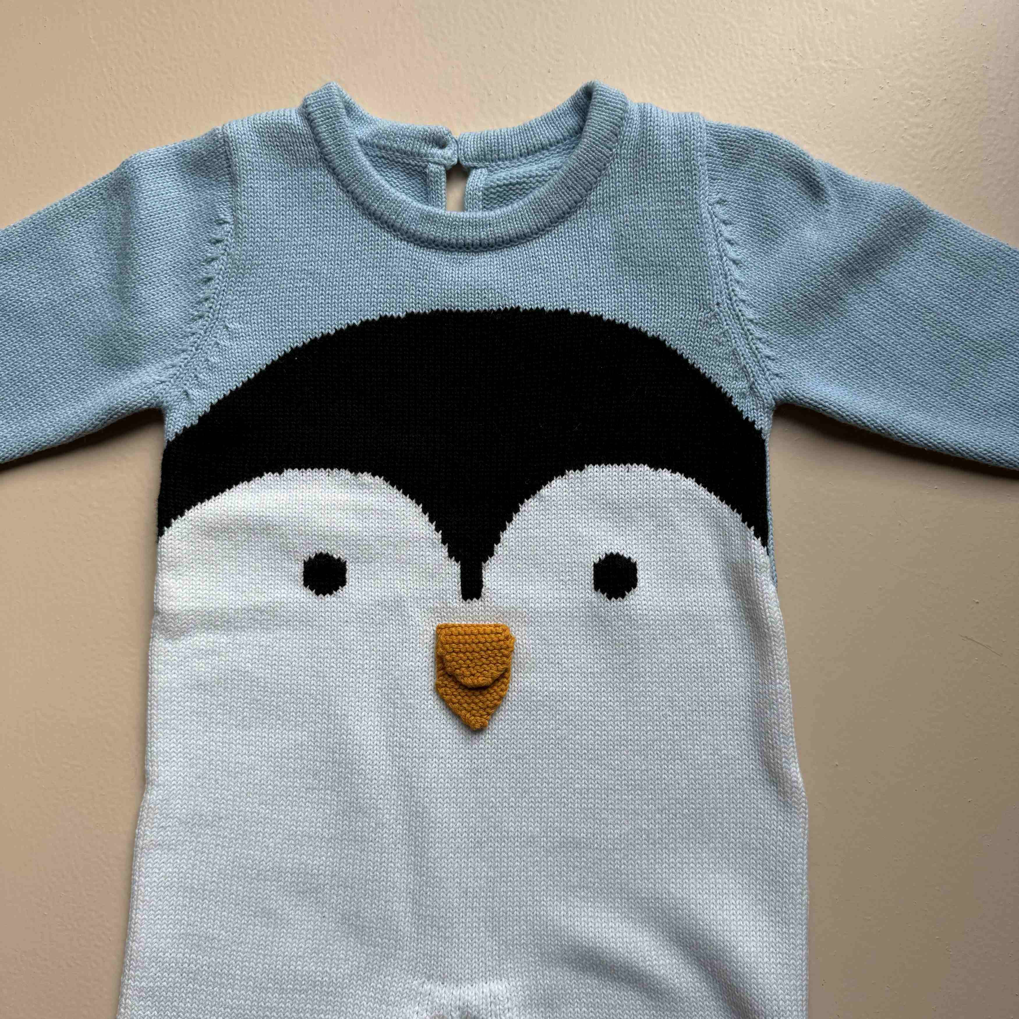 The adorable penguin design adds a playful, heart-melting touch, while the 3D knitted beak brings the character to life. Snap buttons at the bottom allow for easy and quick diaper changes, making this romper as practical as it is cute.