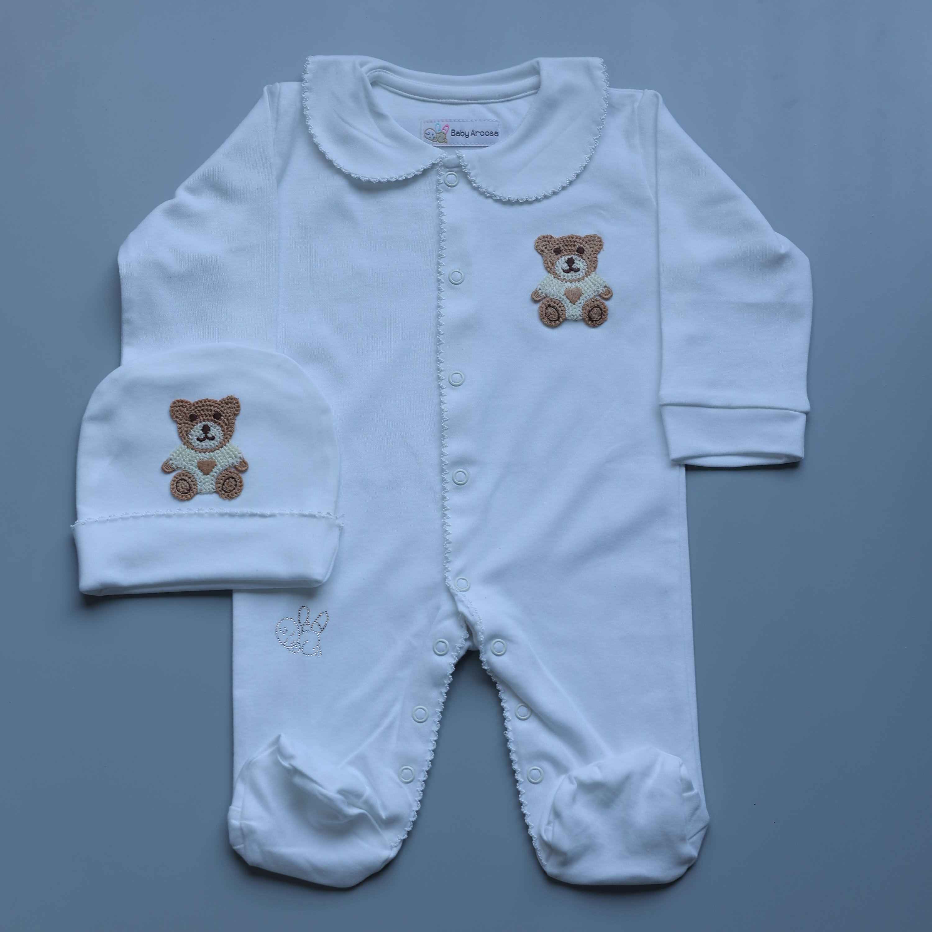 This set is thoughtfully crafted to ensure a cozy and snug fit, featuring elegant picot edging along the romper's collar and seems for a refined finish. The enchanting teddy bear embroidery adds a playful and heartwarming touch to this all inclusive set which includes: