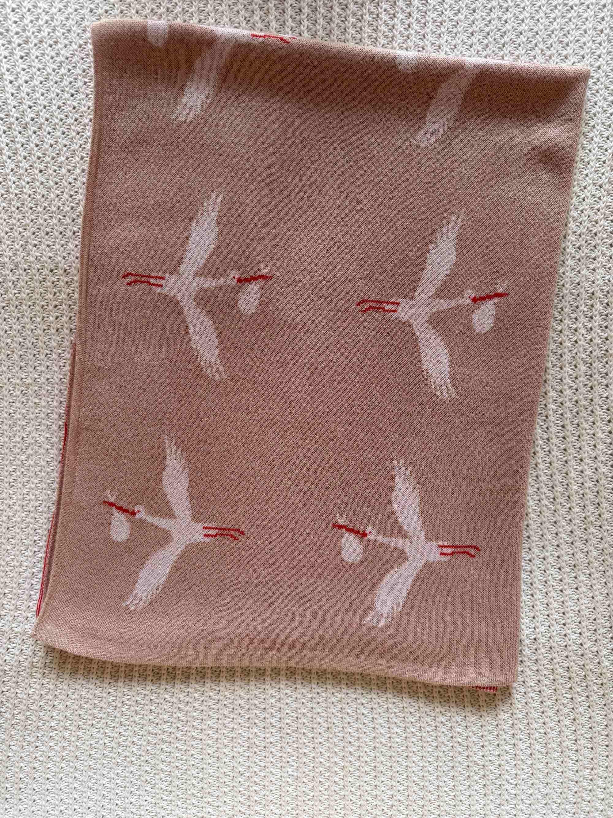 The blanket features an elegant stork motif gracefully woven across a soft beige base, symbolizing the beautiful arrival of a new baby. The delicate stork print with subtle red accents adds a refined, storybook charm that feels both playful and sophisticated, making it a lovely addition to any nursery.