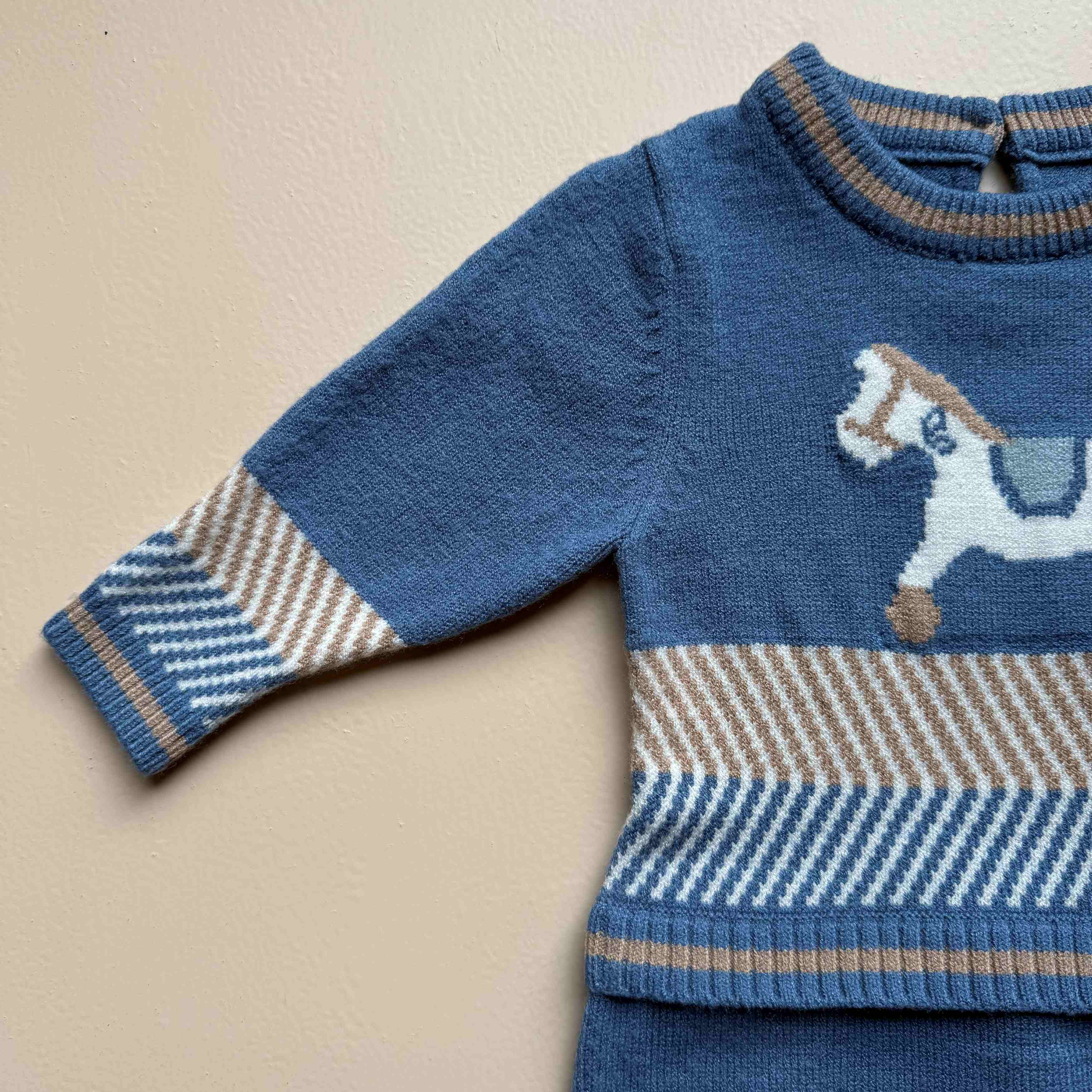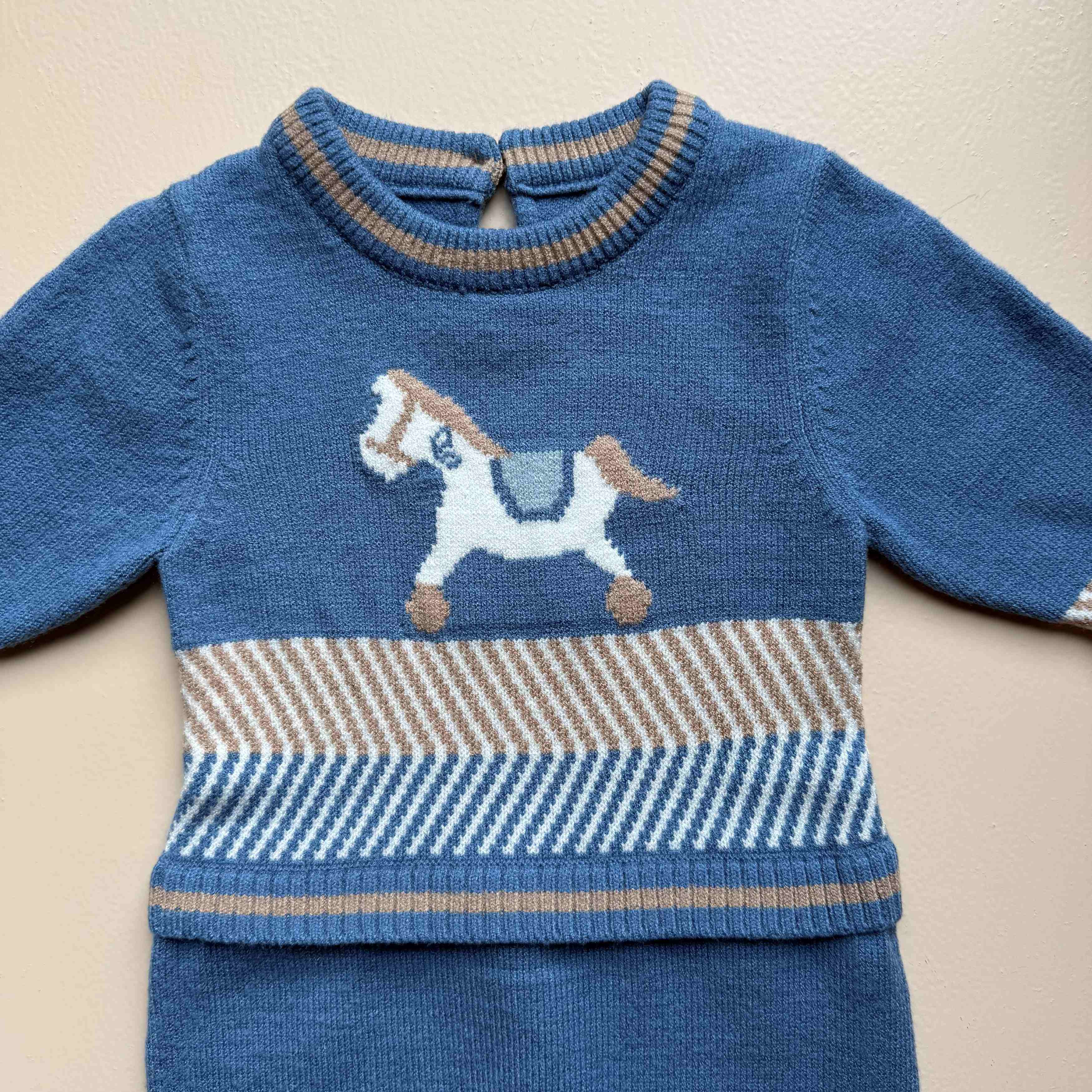 Add a touch of storybook charm to your baby’s wardrobe with our Blue Pony Knit Set. Crafted from ultra-soft, breathable yarns, this cozy two-piece outfit is gentle on delicate baby skin while keeping your little one snug and warm all day long.