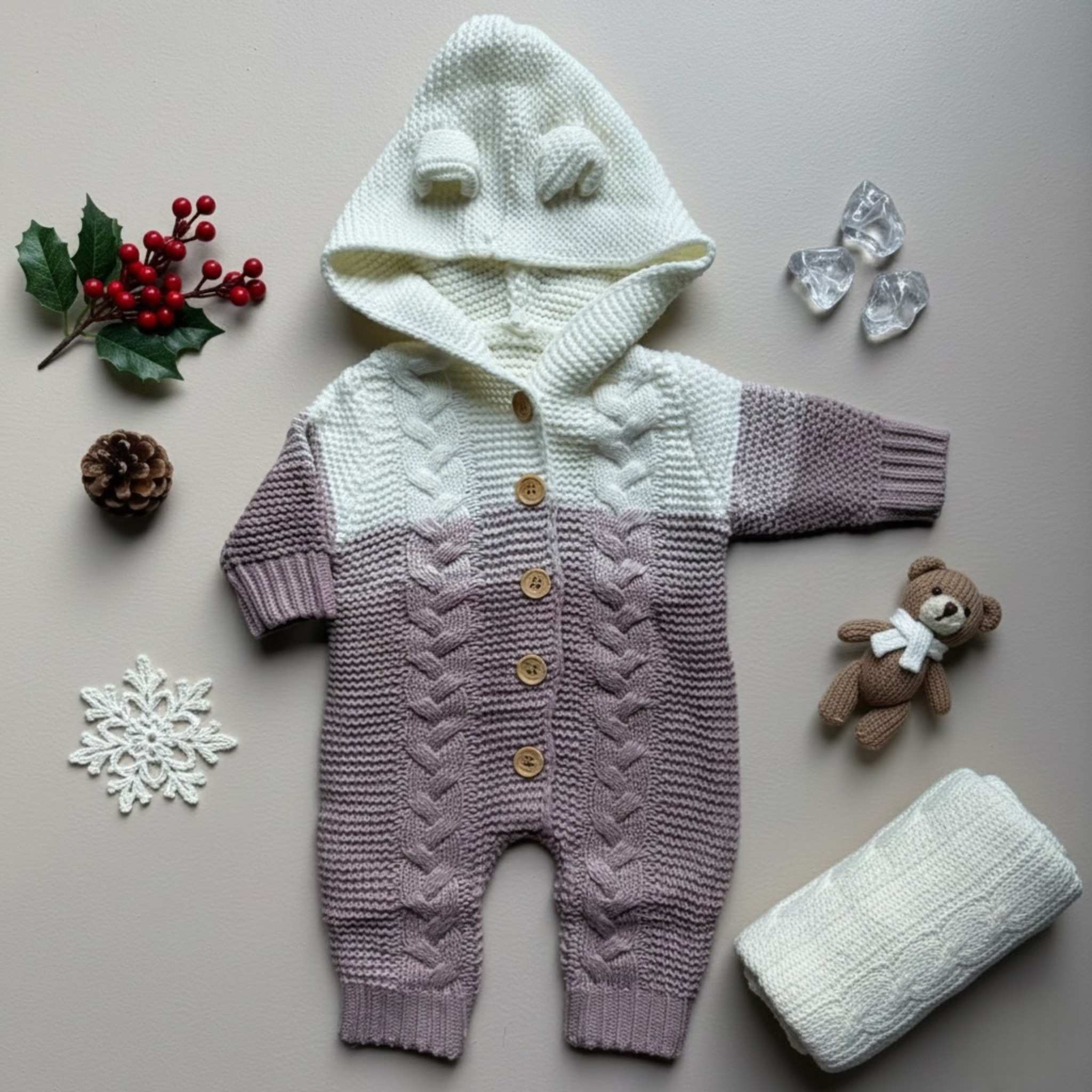 The Lilac Ombre Bunny Knit Jumpsuit is a lovingly crafted heirloom piece that brings together softness, elegance, and playfulness for your little one. Featuring a dreamy gradient that fades from warm ivory into a soothing lilac shade, this jumpsuit offers a modern yet timeless look perfect for winter days, baby photos, and gifting.