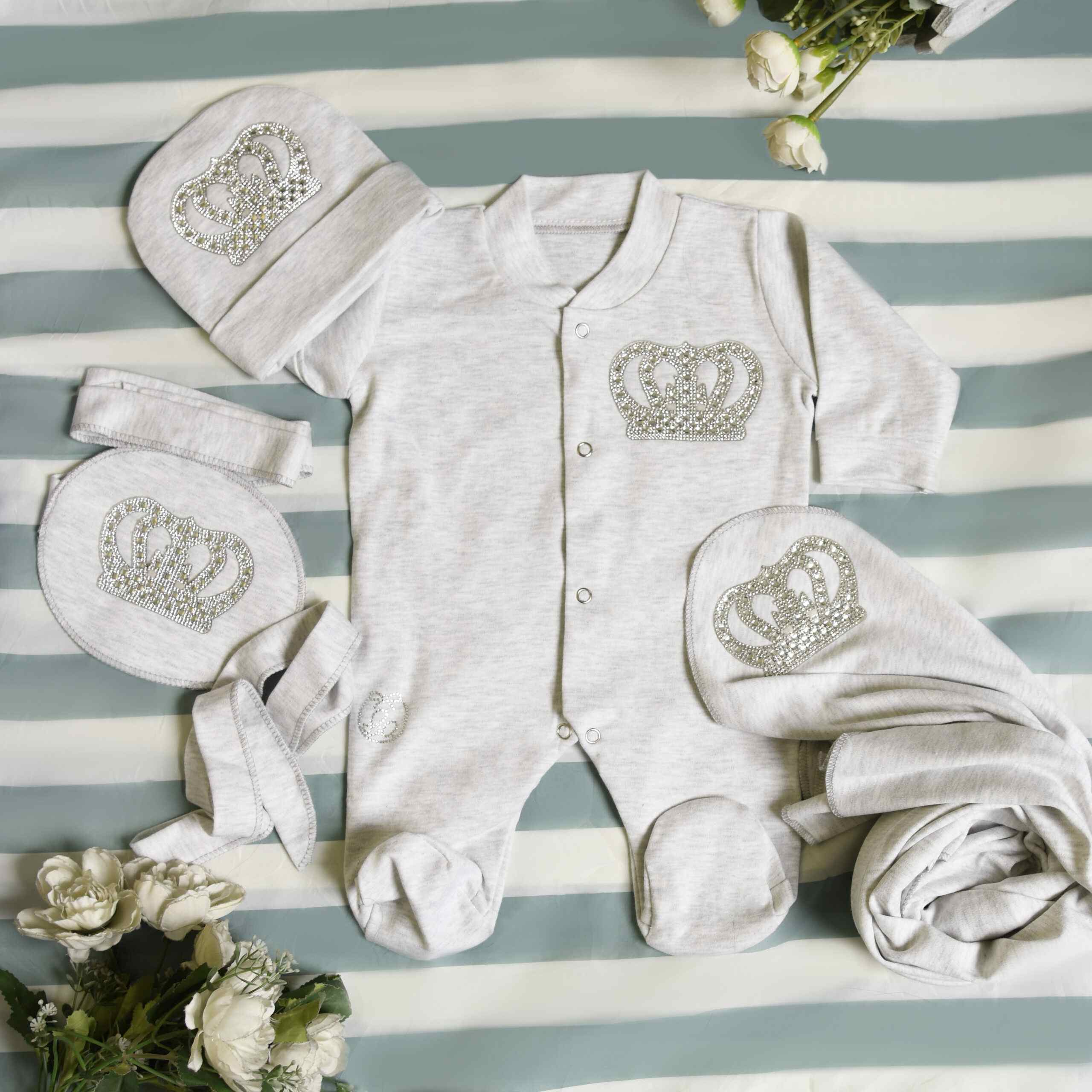 The use of 100% pure cotton and the attention to comfort, such as the silver crown embellishment patch which is stuck over a protective layer and added to the garment, making no form of direct contact of rhinestones to the baby’s delicate skin.