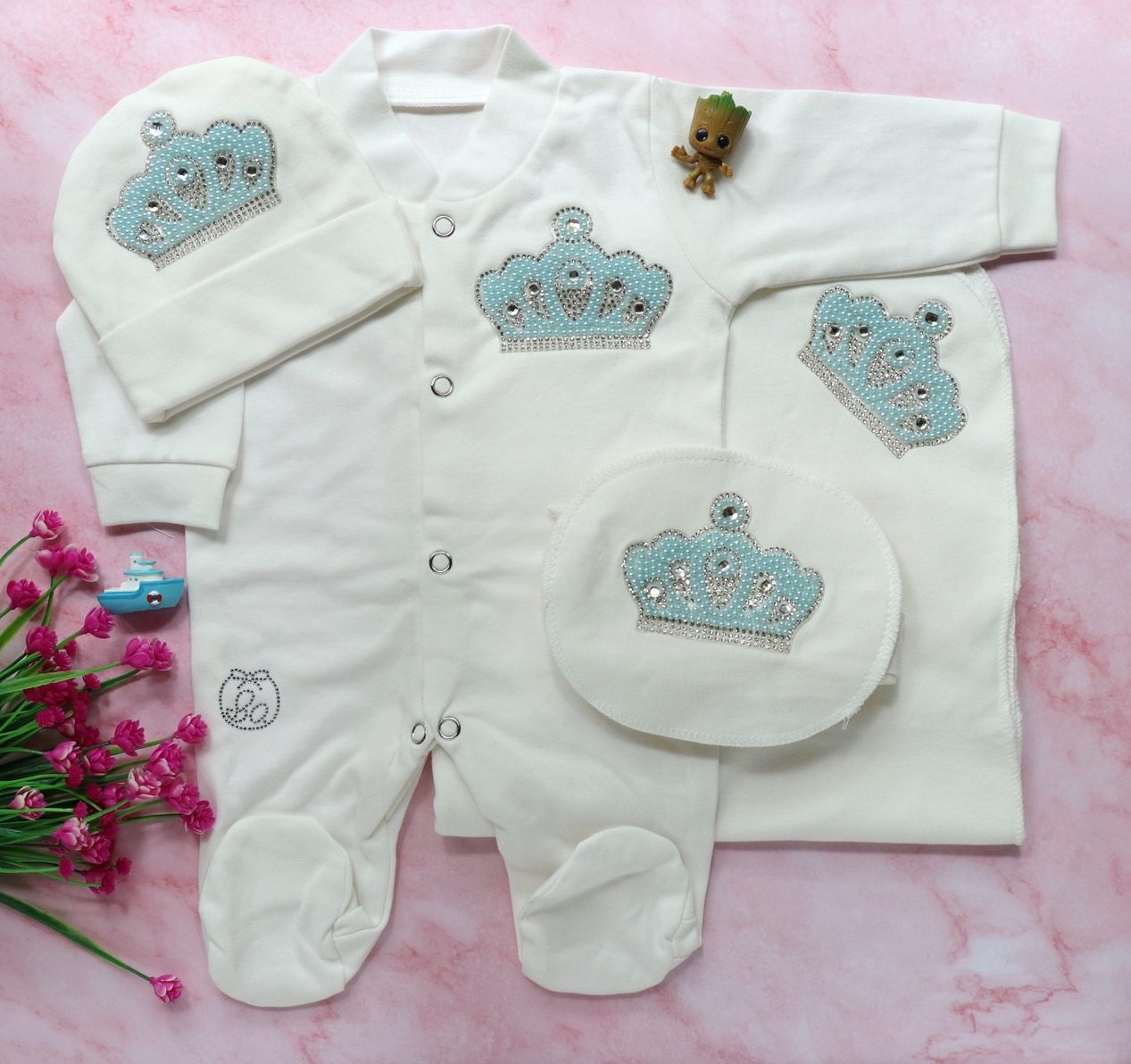 The inclusion of a cap, super soft swaddle sheet, and belt adds to the versatility and fashionability of the set. The white color of the set gives it a clean and fresh look, and the turquoise crown embellishment adds a pop of color, making it a great gift for a little one.